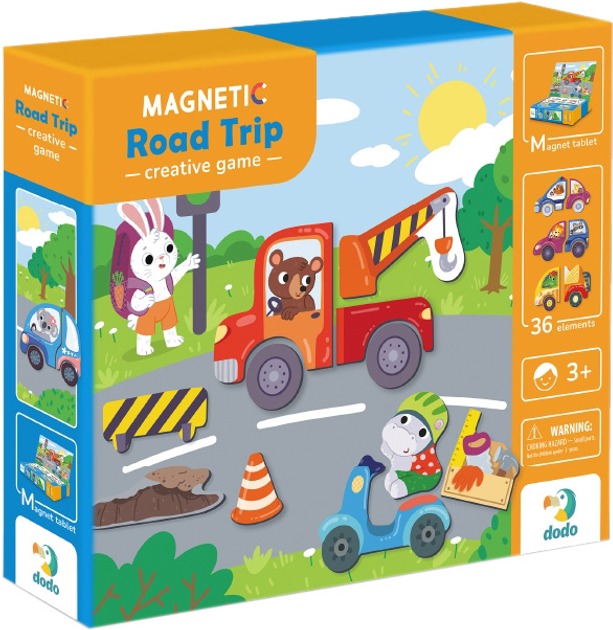 Магнітна гра Dodo Дорожні пригоди – це захоплюючий набір, створений для дітей від 3 років, щоб вони могли вирушити в неймовірні подорожі та створювати власні дорожні історії. Цей набір включає в себе магнітну дошку та 36 магнітів з різними частинами транспорту та елементами дорожніх пригод.